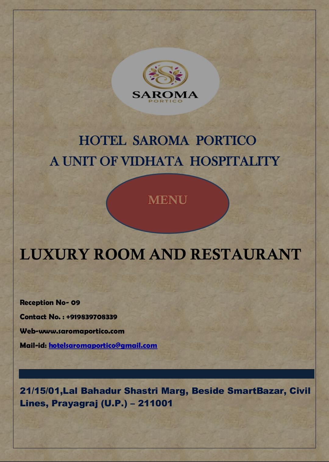 Hotel Saroma Restaurant at Portico is a premium and elegant dining destination where great taste, a peaceful ambiance, and excellent hospitality come together perfectly. Guests can enjoy a carefully curated selection of Indian, Chinese, and Continental cuisines, specially prepared by experienced chefs using fresh, high-quality ingredients.